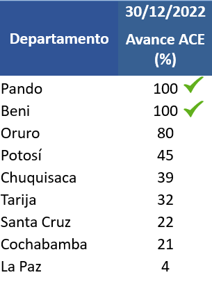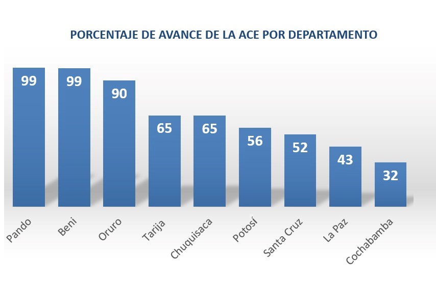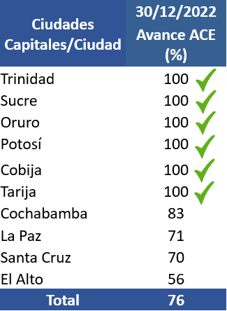 Vale destacar que a la fecha el operativo de la (ACE) en las ciudades capitales de Trinidad, Sucre, Oruro, Potosí, Cobija y Tarija concluyó en un 100%, y el resto de las ciudades supera el 50%, es así que la ciudad de Cochabamba llegó a un 83%, La Paz 71%, Santa Cruz 70% y la ciudad de El Alto a un 56%.