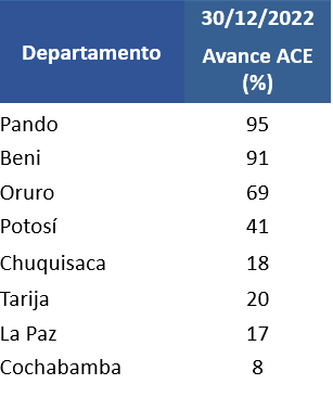 El trabajo de la ACE inició el 24 de mayo de 2022 en las ciudades capitales de Pando, Beni, Oruro y Potosí y fue avanzando de forma paulatina al resto de los departamentos del país cuya tarea se prevé concluir en agosto del 2023.