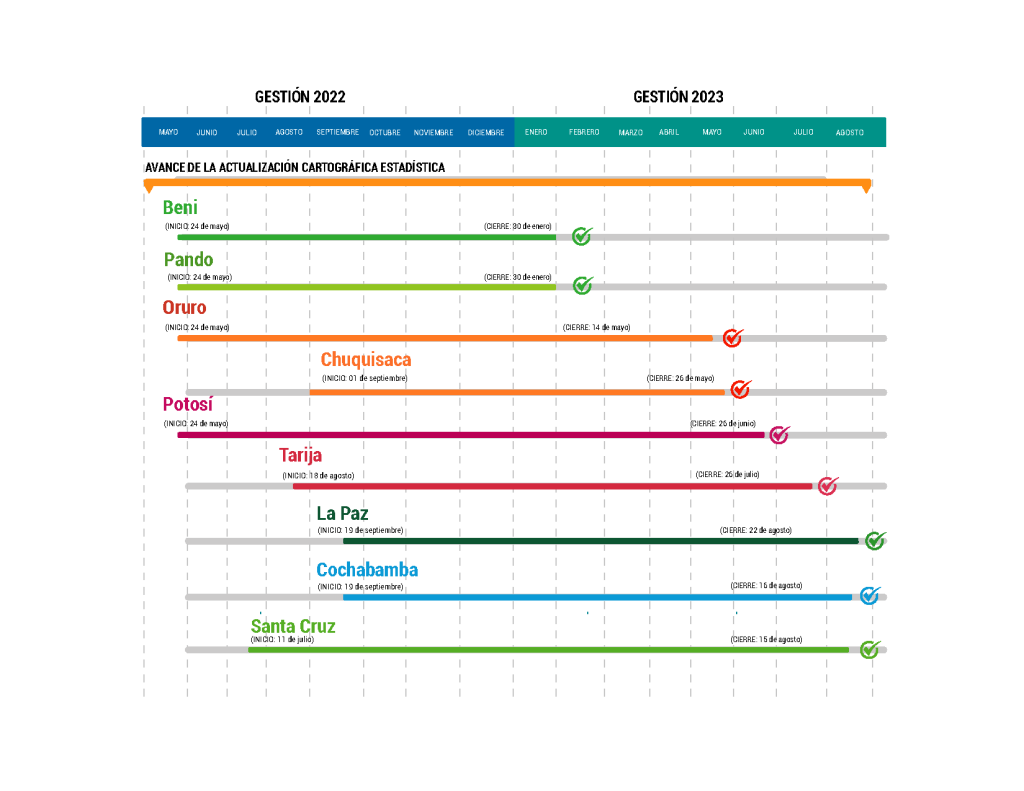 La generación del marco censal fue objeto de múltiples controles de calidad y validación por distintas áreas técnicas del INE. Se implementó un protocolo de revisión cruzada entre las áreas de Cartografía, Informática, Muestreo y Logística, así como Operativos de Campo, garantizando la coherencia de la base de datos, la correcta codificación y la precisión cartográfica. Cada observación detectada se ajustó hasta lograr el cierre oficial del marco censal departamental, respaldado por la validación técnica y el visto bueno de las áreas involucradas. Este marco censal, concluido en enero de 2024, constituye la base oficial y definitiva para la planificación, ejecución y control del operativo censal, asegurando la cobertura integral y precisa del territorio nacional.