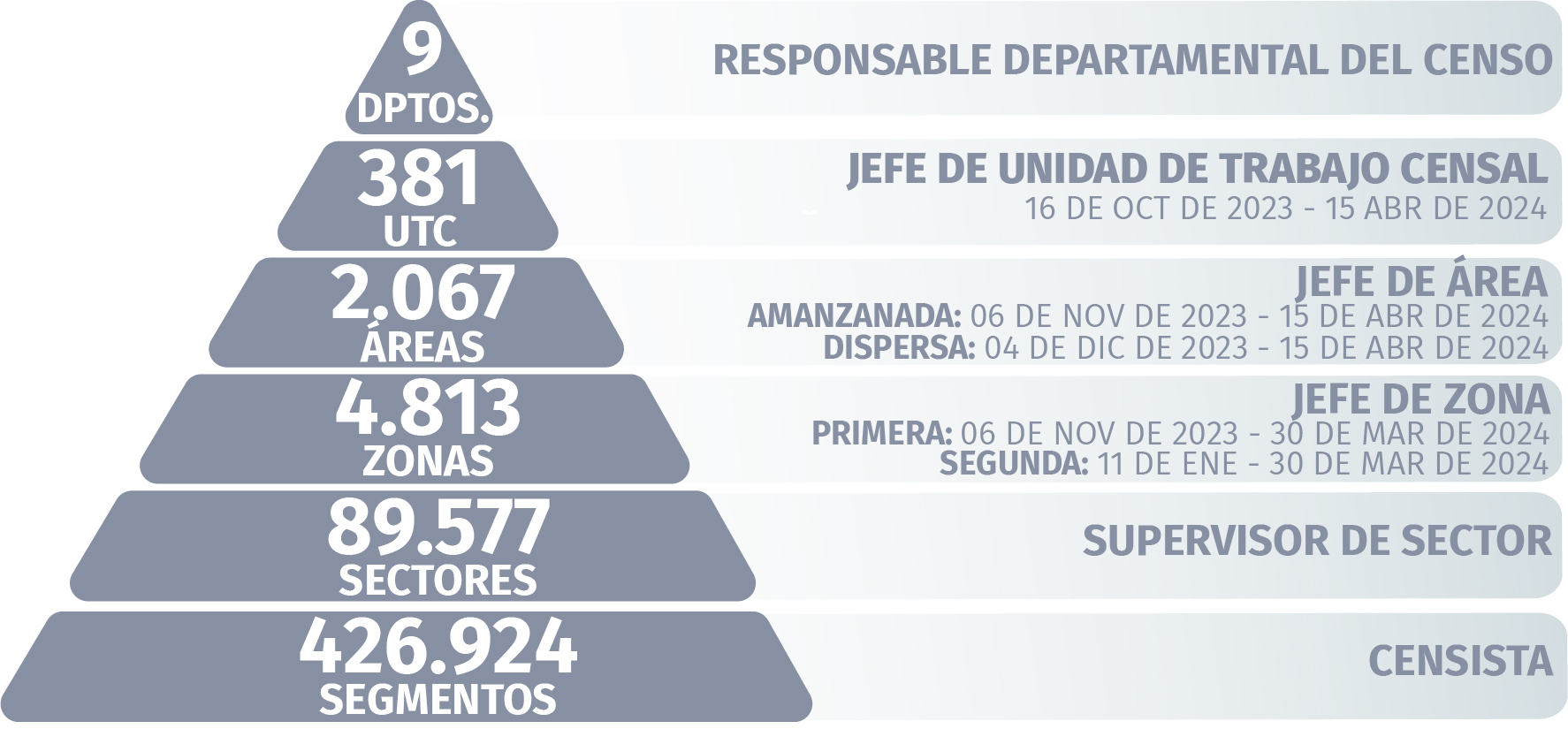Para la organización de las actividades del Censo de Población y Vivienda se conformó una estructura jerárquica, conformada por: jefe de Unidad de Trabajo Censal (UTC) (uno por municipio o AIOC y para municipios con alta población, dos o tres jefes de UTC), jefe de área (dispersa y amanzanada), jefe de Zona (amanzanada), supervisor de sector y censista.