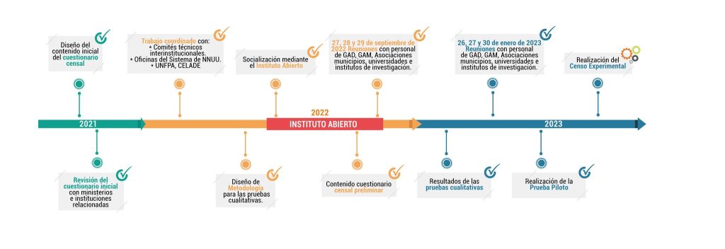 Para la elaboración del contenido del “cuestionario censal” se establecieron reuniones técnicas con 20 instituciones, 18 de ellas instituciones estatales, un organismo internacional y un colectivo social para analizar los temas del Cuestionario, como: Migración, Idioma y cultura, Salud, fecundidad, mortalidad, Dificultades permanentes/discapacidad, Educación, Tecnologías de información y comunicación, Empleo, Vivienda, Servicios básicos y Medio ambiente, Otras temáticas identidad de género y violencia, Participación ciudadana, Revisión a detalle del Cuestionario censal.