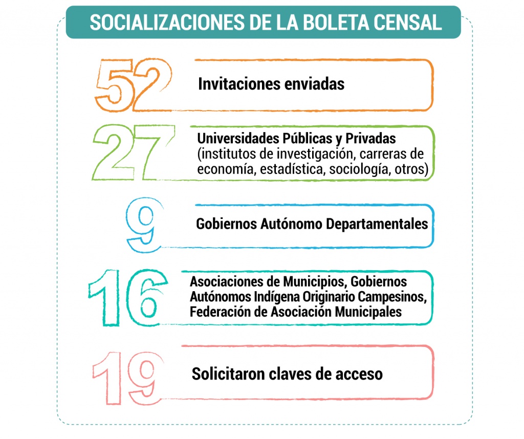 Asimismo, se cursaron 52 invitaciones, de las cuales 27 eran para universidades públicas y privadas (institutos de investigación, carreras de economía, estadística, sociología, otros), nueve a gobiernos autónomos departamentales, 16 a las asociaciones de municipios, gobiernos autónomos indígena originario campesinos, federación de asociaciones municipales, y solo 19 instituciones solicitaron clave para ingresar a este sitio.