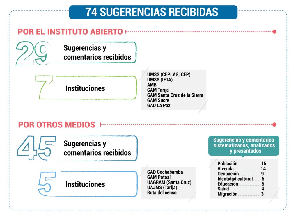 El “Instituto Abierto” permitió al INE recibir 29 sugerencias de diferentes entidades para diferentes temáticas del cuestionario censal porque solicitaron la clave para poder ingresar. De esta cantidad siete correspondían a diferentes instituciones, entre ellas están: la Universidad Mayor de San Simón (UMSS), Universidad Mayor de San Andrés (UMSA), la Asociación de Municipalidades de Bolivia (AMB), de los gobiernos autónomos municipales de Tarija, Santa Cruz de la Sierra, Sucre y del Gobierno Autónomo Departamental de La Paz.