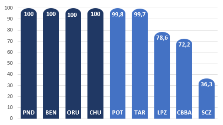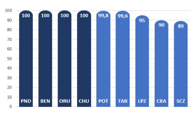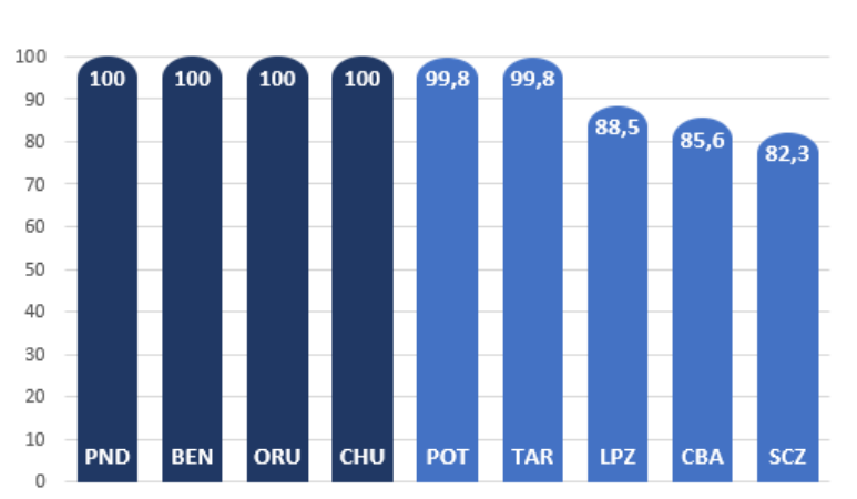 A nivel departamental, Pando, Beni y Oruro llegaron al 100%, el departamento de Potosí alcanzó el 93%, a este le sigue Tarija con el 88%, Chuquisaca con el 87%, La Paz con el 85%, Santa Cruz registró un 82% y Cochabamba un 80%.
